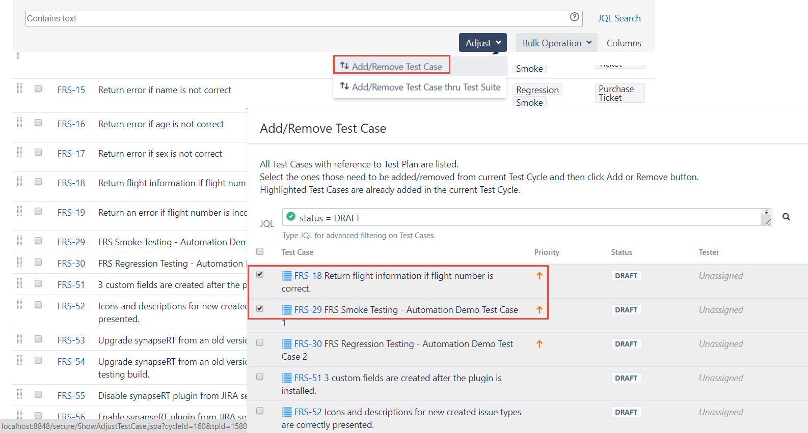 2) You can use JQL to filter the Test Cases from the listClick "Add" button to add additional ones or click "Remove" to remove existing ones