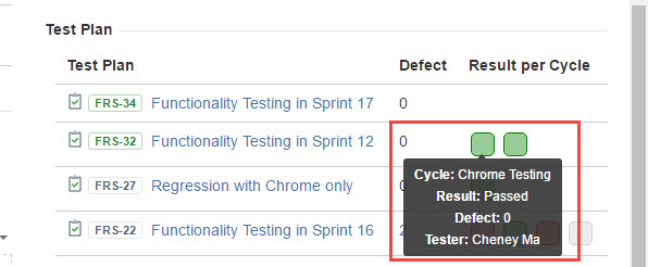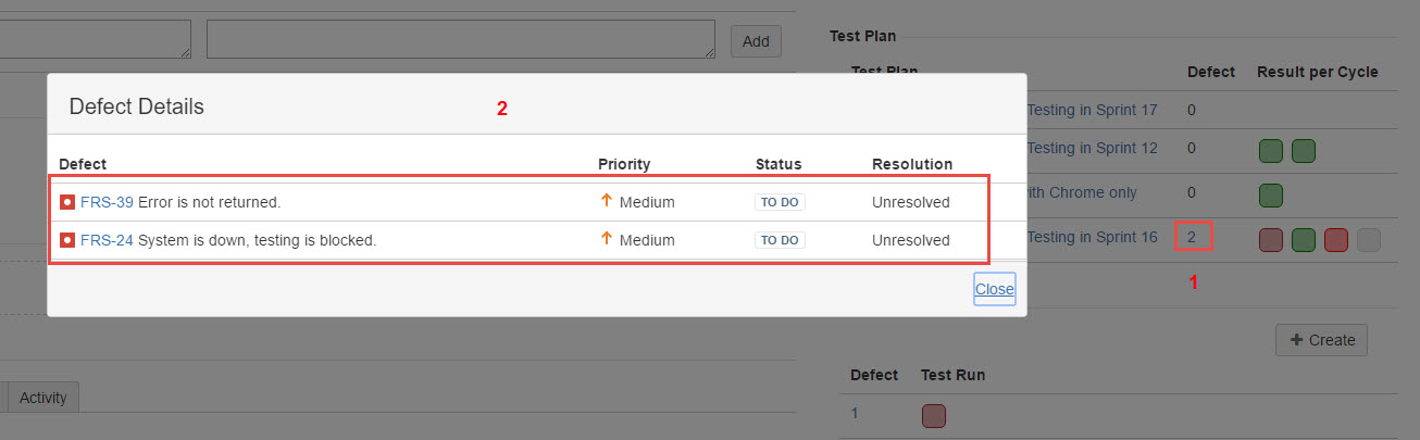 5. If you click on a number in the "Defect" column, a "Bug Details" dialog box will pop up with the list of bugs created against the Test Case