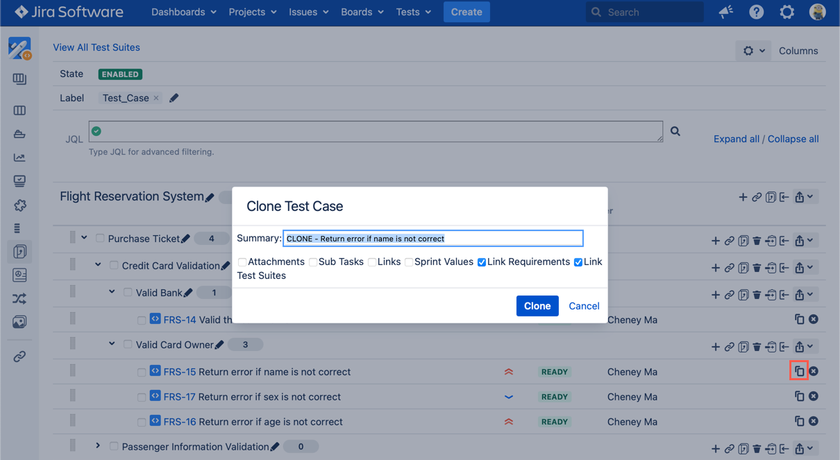 - Click 'Clone Test Case' icon following the Test Case