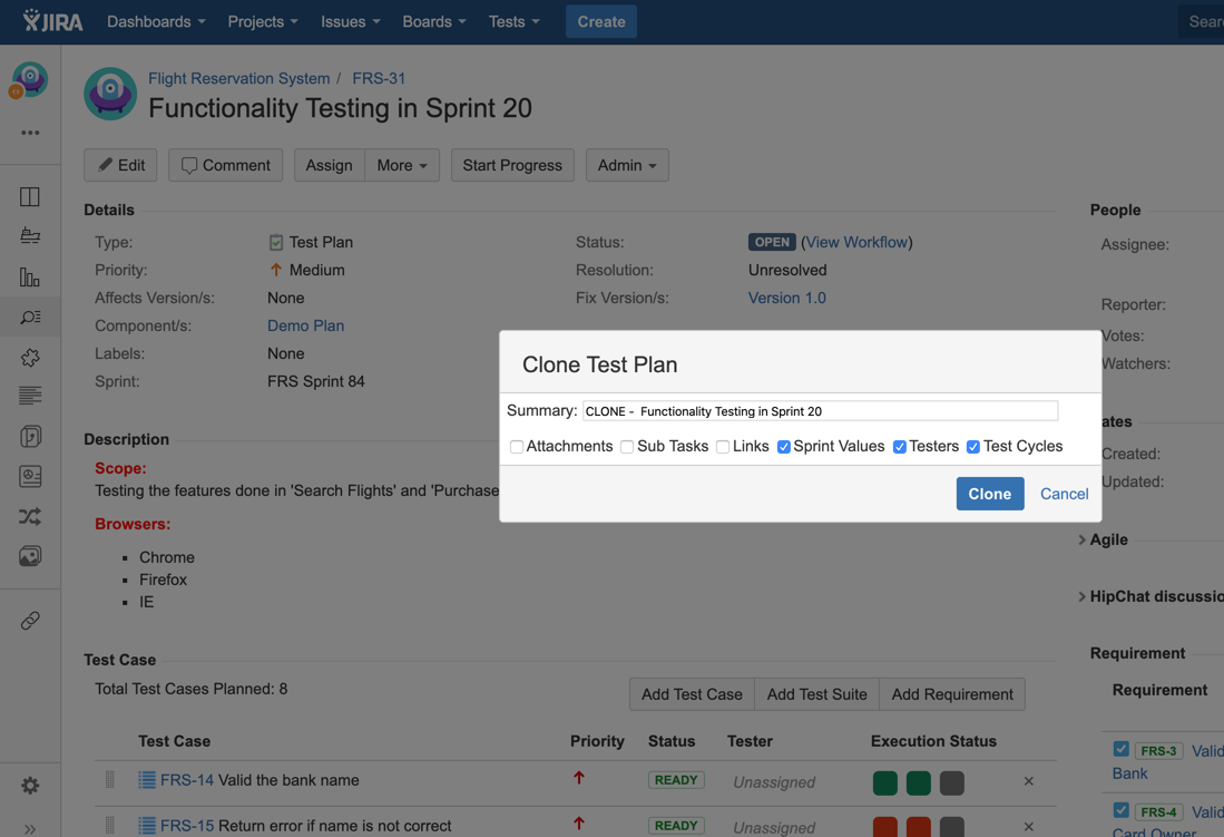 Once the clone is done, a new Test Plan issue will be created for your current project.