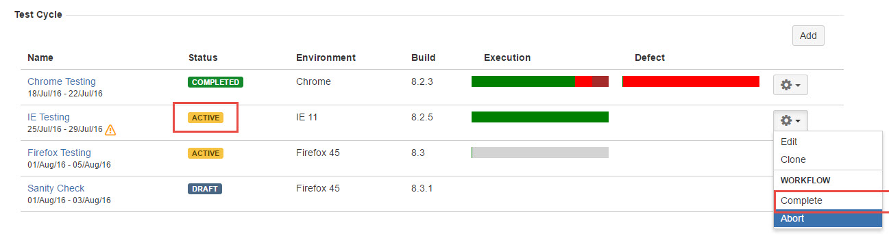 - Click the "Gear" icon from a Test Cycle in "ACTIVE" status