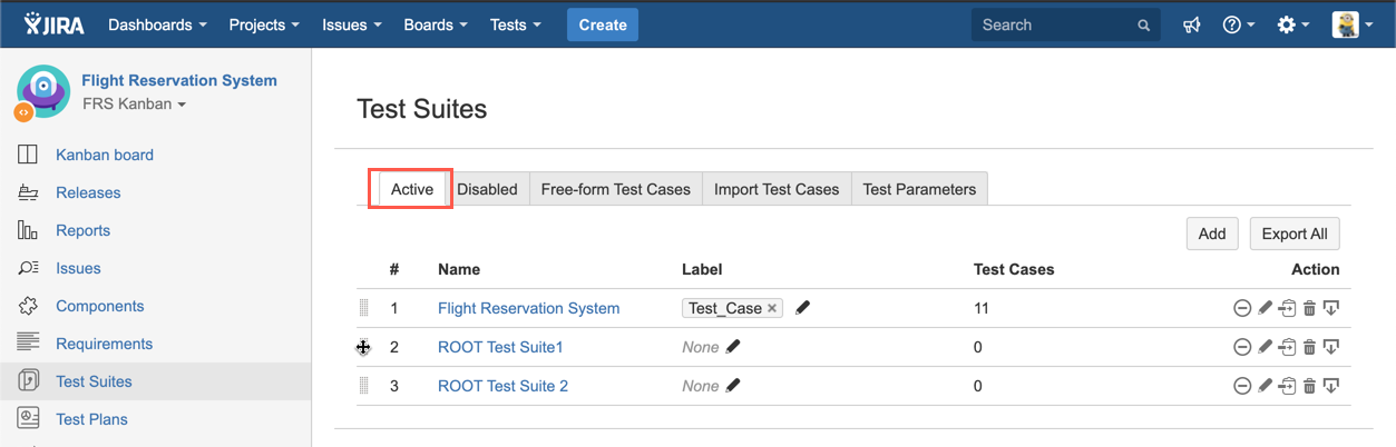 4. Once the Root Test Suite is added successfully, it will be present in the "Active" tab.