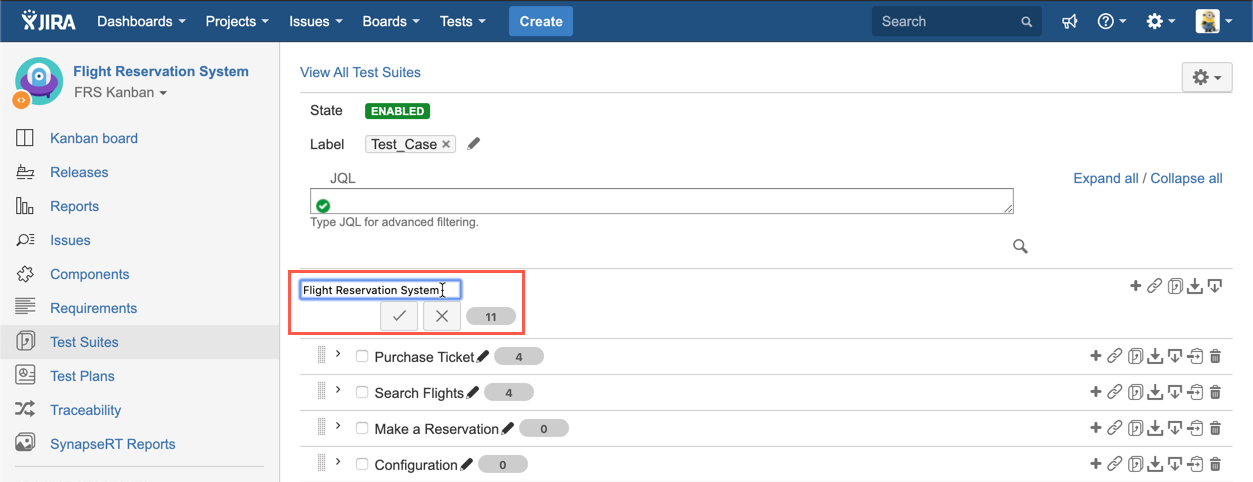 5. You can update the Root Test Suite name and add a label to it by clicking the "Edit" button.