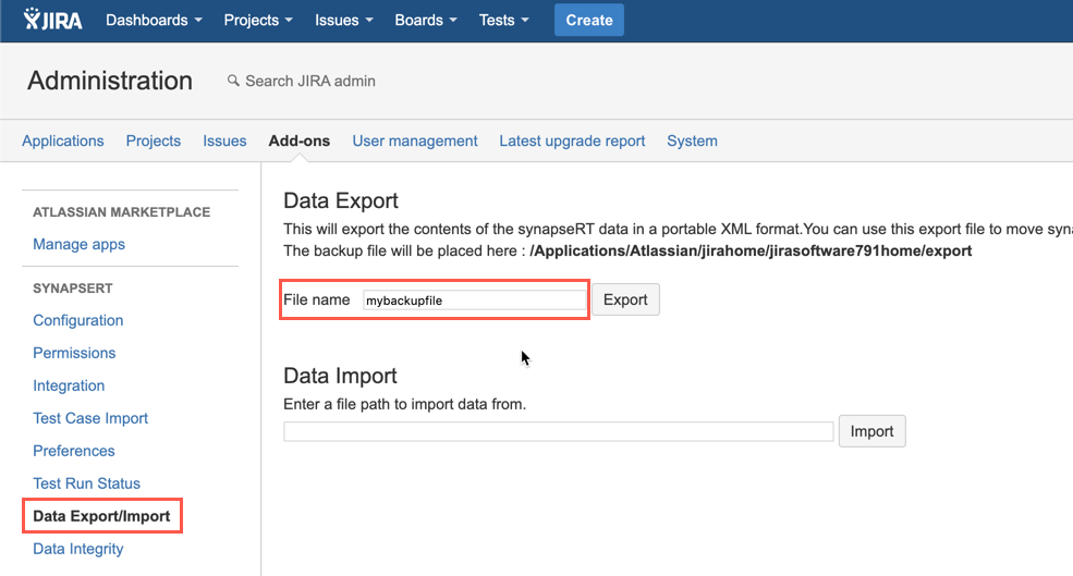 Click the "Data Export/Import" link from the left panel under the "TestRay" section.