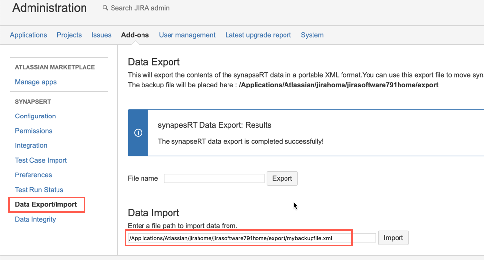 TestRay data import can ONLY be started after Jira project import is done in target Jira instance, please refer to Jira online documentation on how to restoring a Jira project from backup.
