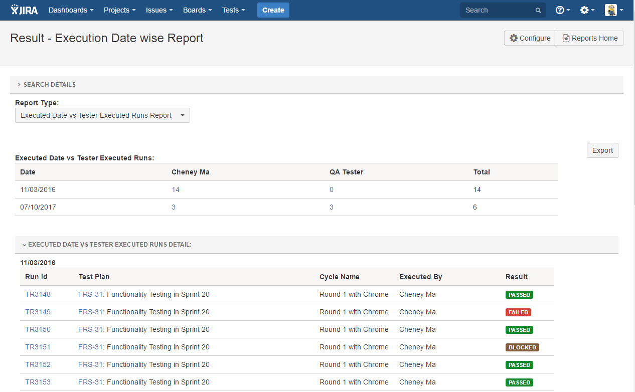 Executed Date vs Tester Executed Runs Report