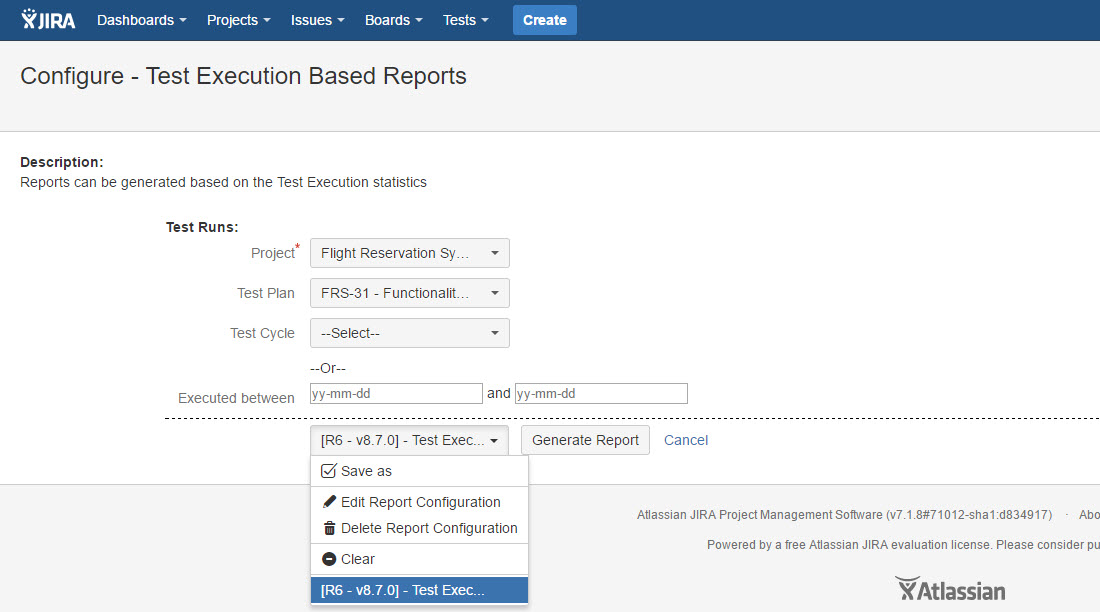 - Specify "Executed between" to generate a period test results for RequirementsYou can switch to other sub report types by selecting them from "Report Type" dropdown