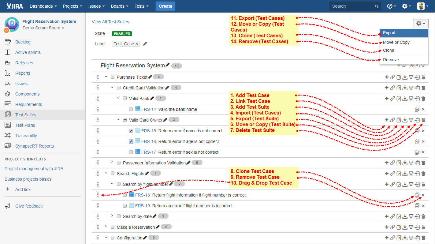 Delete Test Suite: It will delete the test suite with its test case associations and hierarchy information, please note that it only deletes the linkage, the test case issues still stay in JIRA project.
