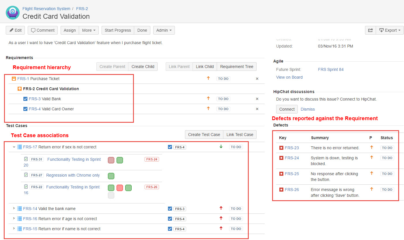 Users are allowed to add one or more "Test Case" issues to an existing Requirement. Once a Test Case issue is added, the relation between Test Case and Requirement has been set up. If the user opens the corresponding Test Case issue, she will see the Requirement is listed as well. This gives the user the ability to check Test Case coverage for the particular Requirement.