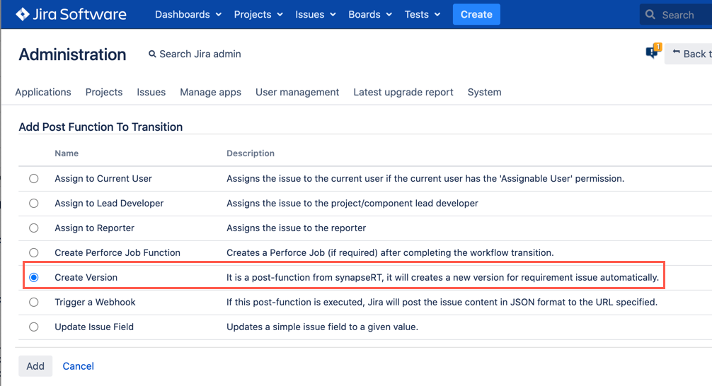 TestRay also allows user to create requirement version automatically though 'Create Version' post function. The post function can be configured in Jira workflow to make sure that requirement version is created automatically during issue status transition.