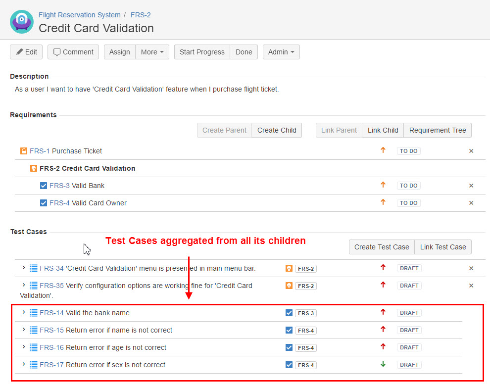 Please note that parent Requirement will display the Test Cases aggregated from all its children (Requirements), Test Cases from its children cannot be removed from the parent Requirement.