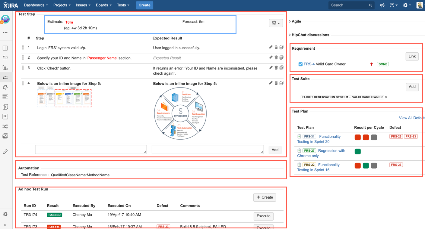 There are six sections offered by TestRay in a Test Case type record that represents the defined Test Steps, covered Requirements, contained Test Suites, executed Test Plans, Ad hoc Test Runs & Automation Test Reference.