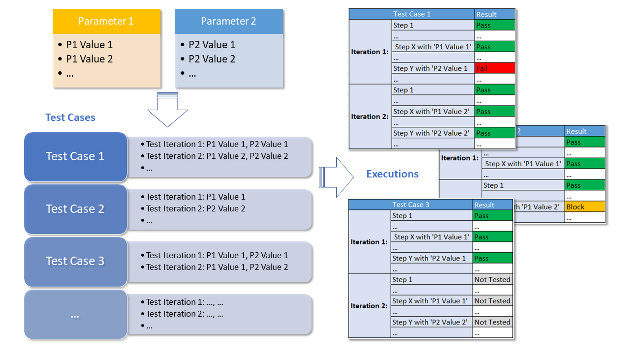 Below diagram shows how 'Test Parameters', 'Test Cases' and 'Test Executions' work together: