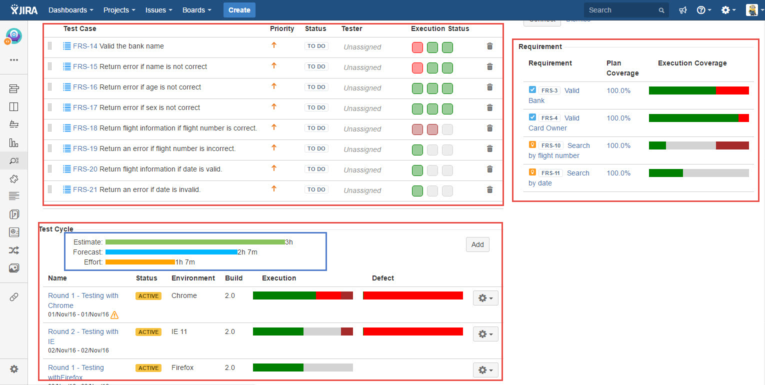 There are three sections offered by TestRay in a Test Plan type record that represents the planned Test Cases, various executing iterations of the planned Test Cases as Cycles and Requirements coverage in a Test Plan.