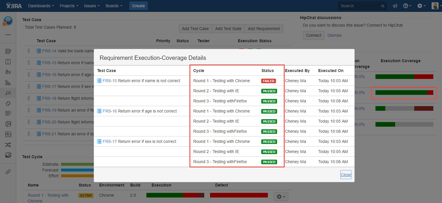 Execution Coverage - This dialog displays a list of Test Cases those are planned for execution from the particular Requirement, followed by test results in different Test Cycles.