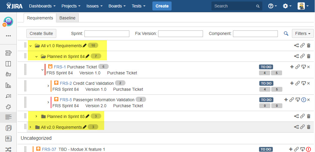 Requirement Suite is to organize requirements in a folder structure, folder structure helps user doing further grouping of requirements besides the requirement hierarchy feature which is already be available.