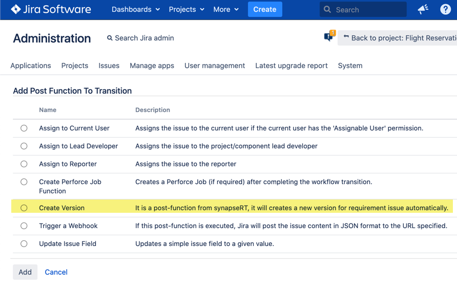 'Create Version' post function helps user creating a new 'Version' automatically once the Requirement issue reaches to a specific 'Status'.