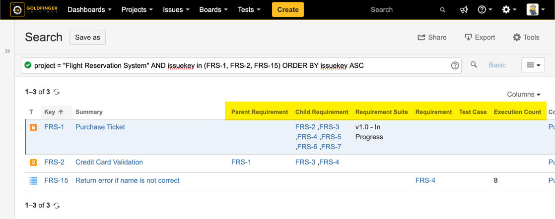 - Parent Requirement/Child Requirement/Requirement Suite: showing additional information from a Requirement issue