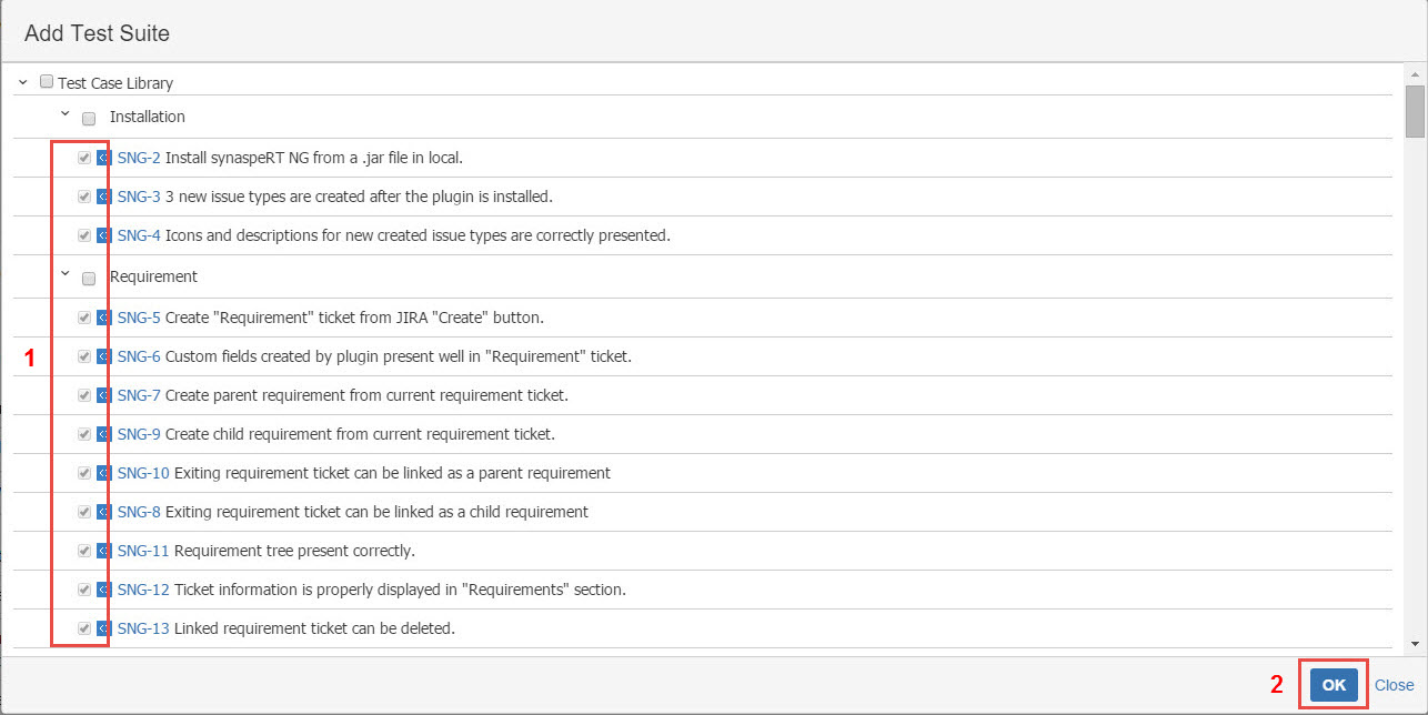 - Select Test Cases by checking the checkboxes from the "Add Test Suite" dialog box