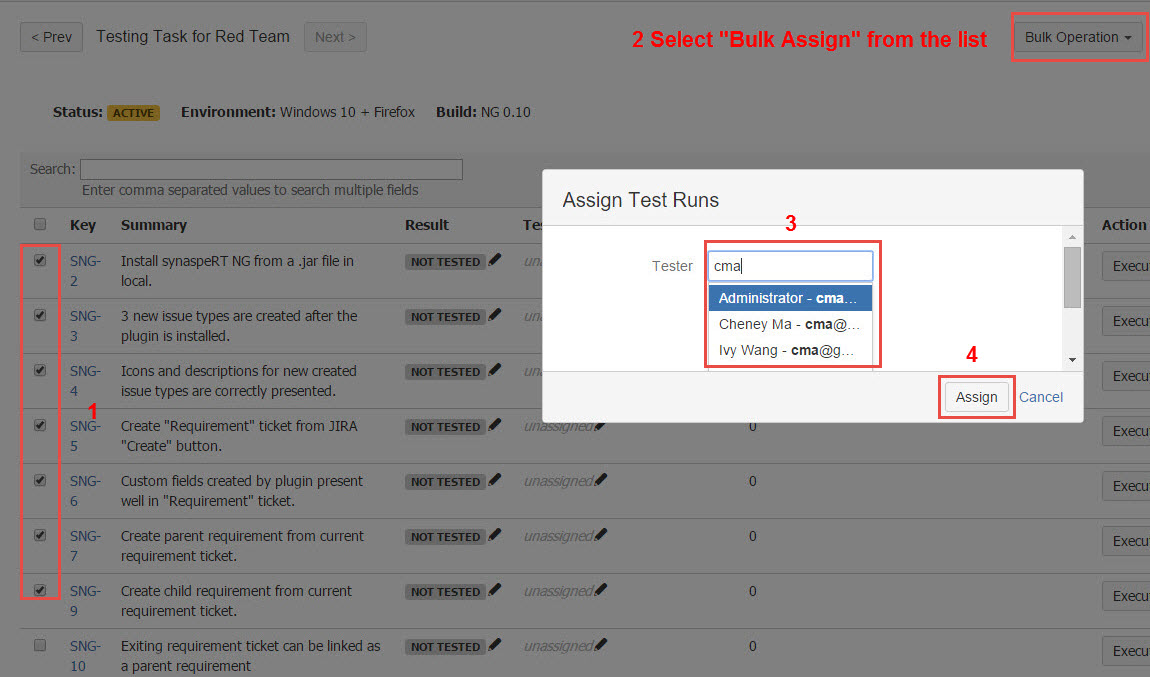 You can also select multiple Test Cases at one time, and assign them to a JIRA user.