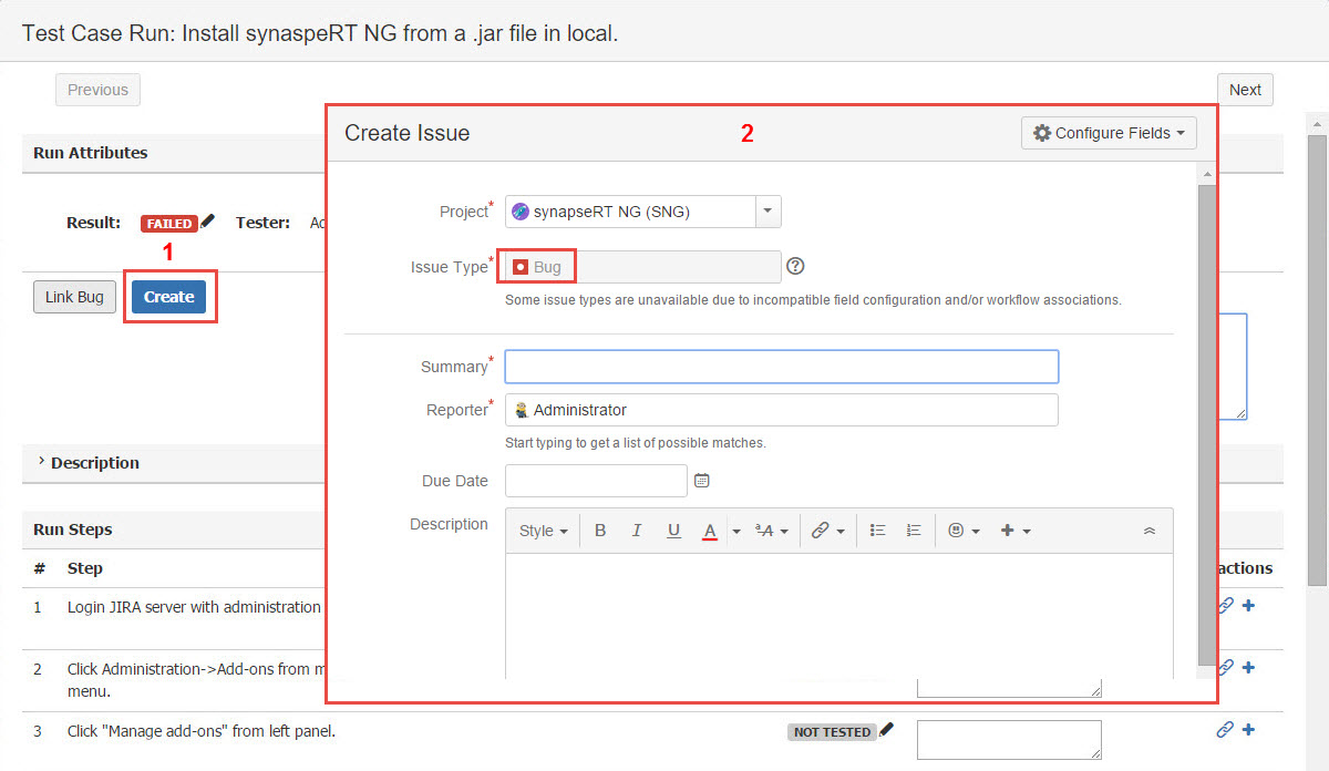 Create bug from a Test Case Run