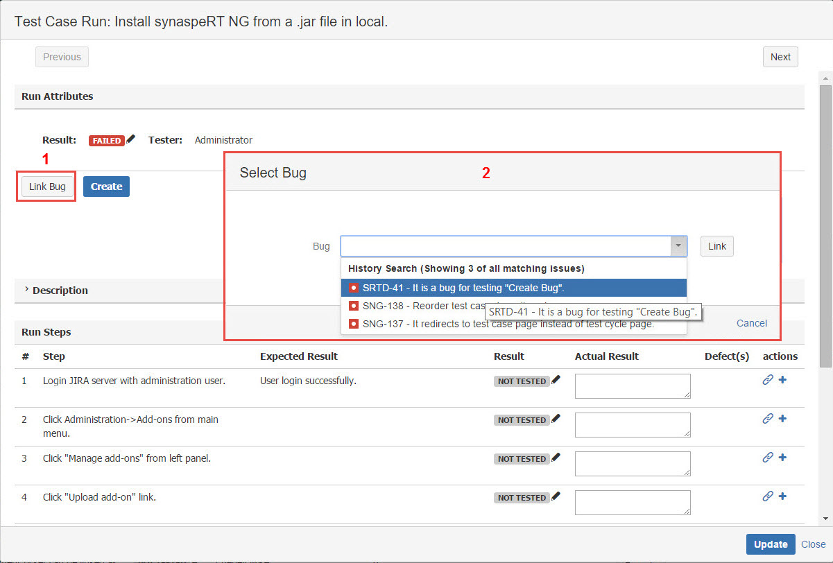 - Select an existing bug, then click the "Link" button from the "Link Issue" dialog box