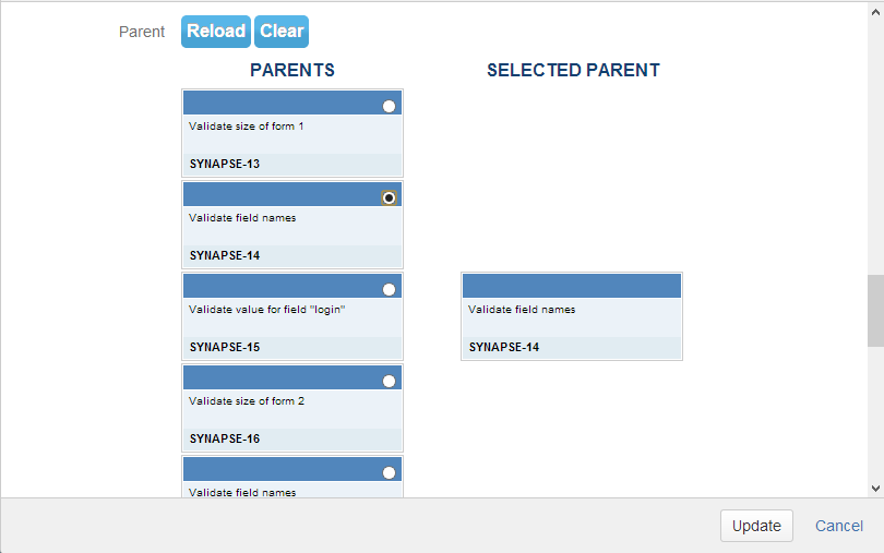 If you have huge amount of requirements and want to organize them into tree view, synapseRT allows you to set a parent record. When you create or edit a requirement you can set a parent requirement for the issue or select None at the parent requirement field.