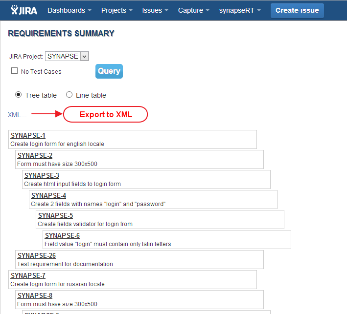 Requirements summary dashboard provides export to XML functionality for Requirements keys and summaries. Open this dashboard using "Requirements Summary" in the synapseRT drop down menu.