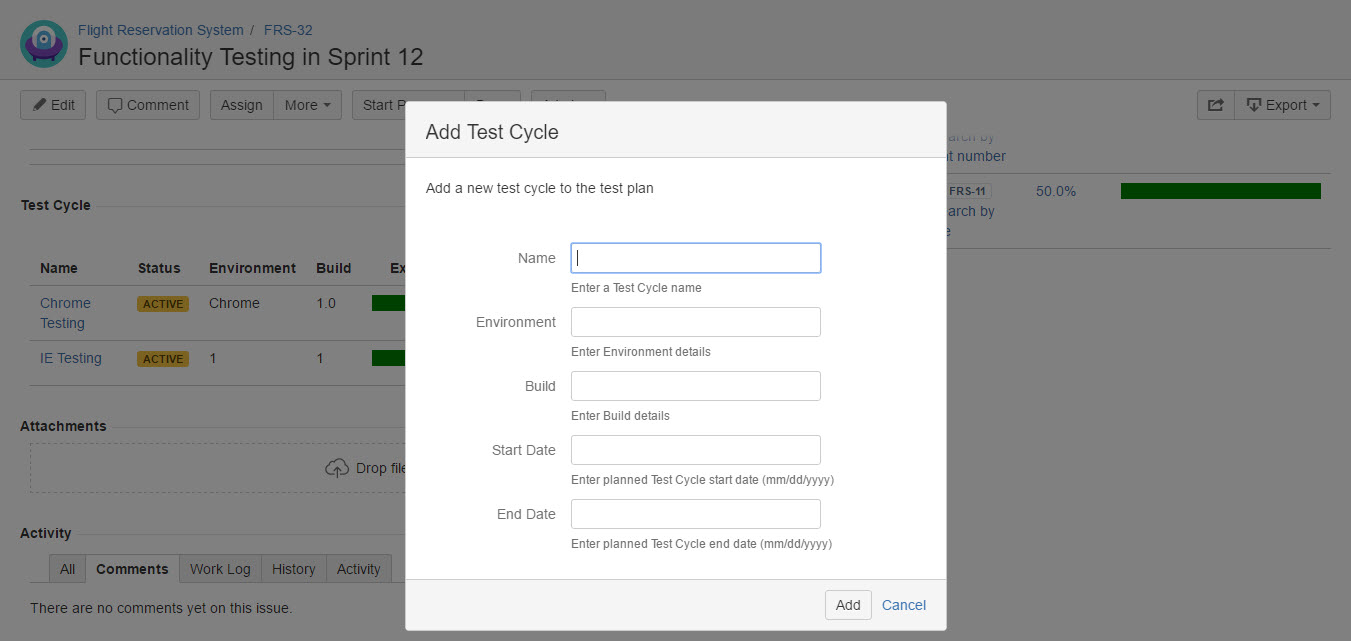 - In the "Add Test Cycle" dialog, specify the information below and click the "Add" button: