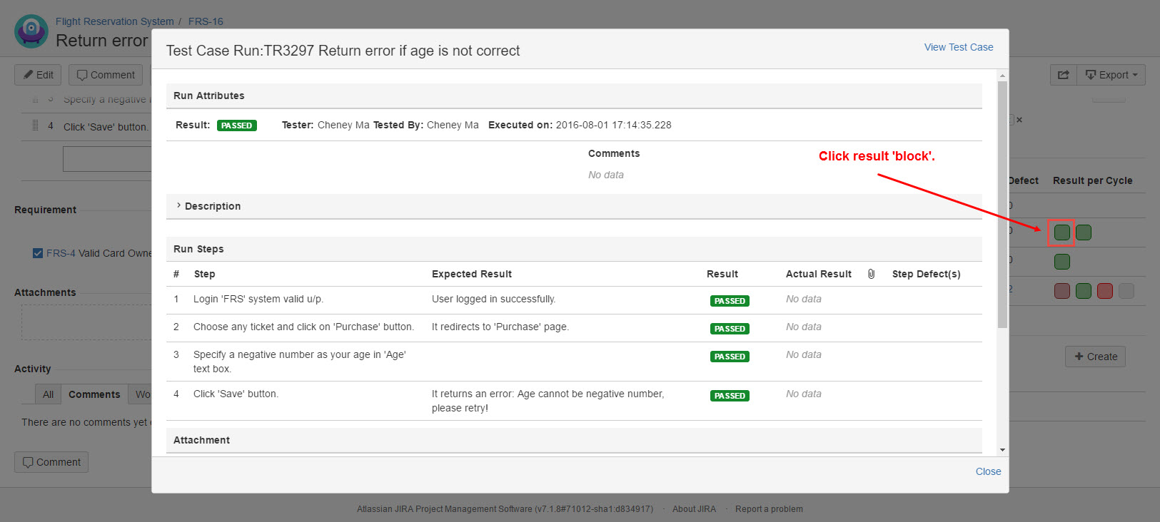 4. If you click the (clolored) test cycle blocks, test case run dialog with detailed execute informaiton will be presented.