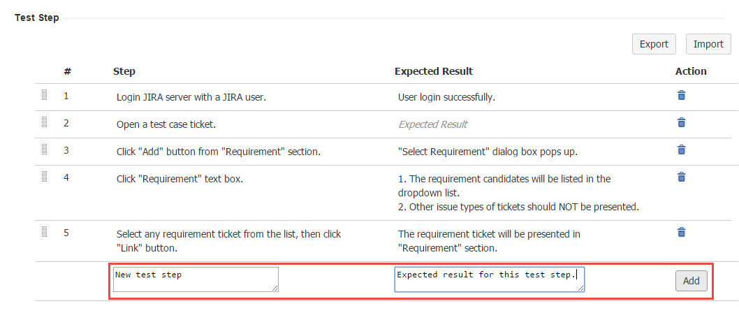 Once the Test Case issue is created, you will see the "Test Step" panel where you will be able to add the Test Steps.
