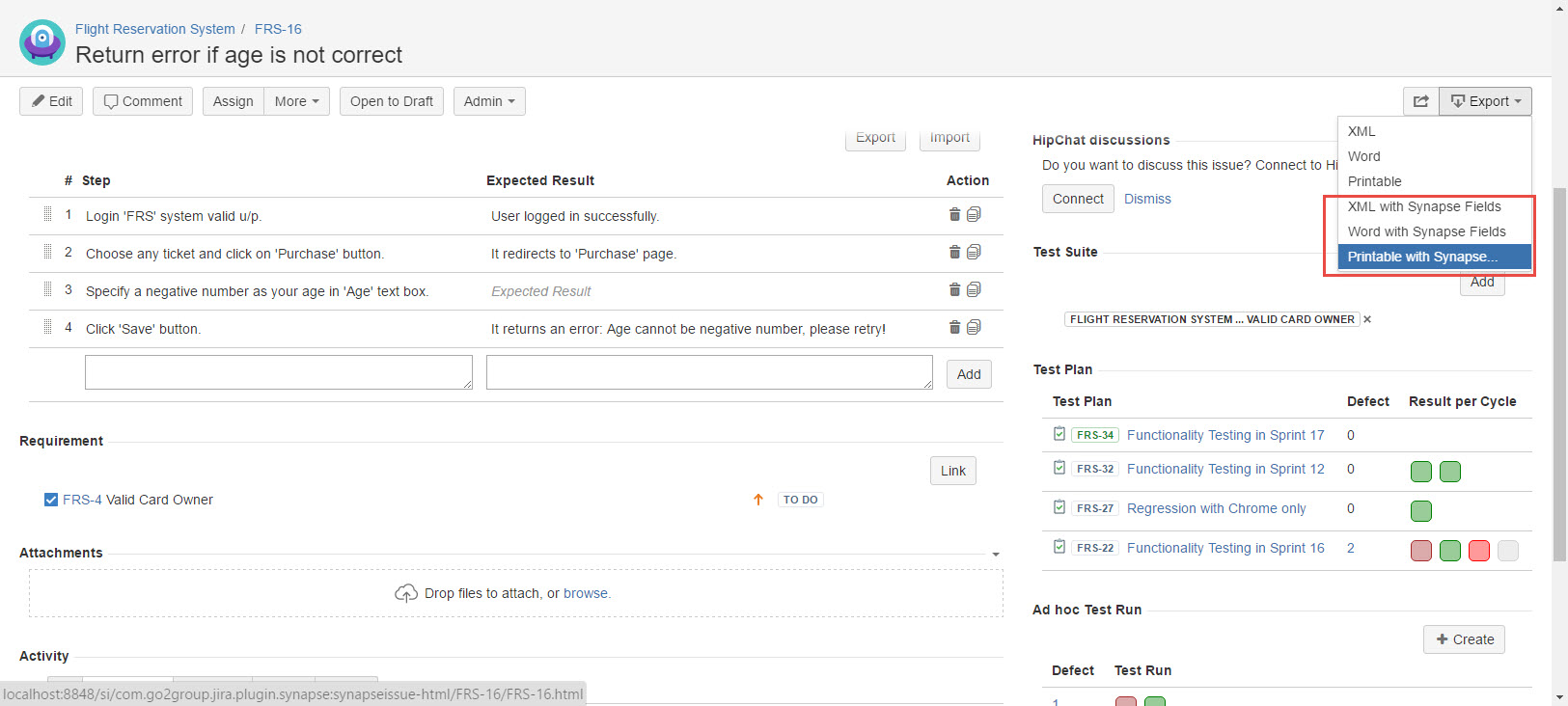 You can either export a single Test Case with synapseRT fields or export them multiply from the JIRA search.