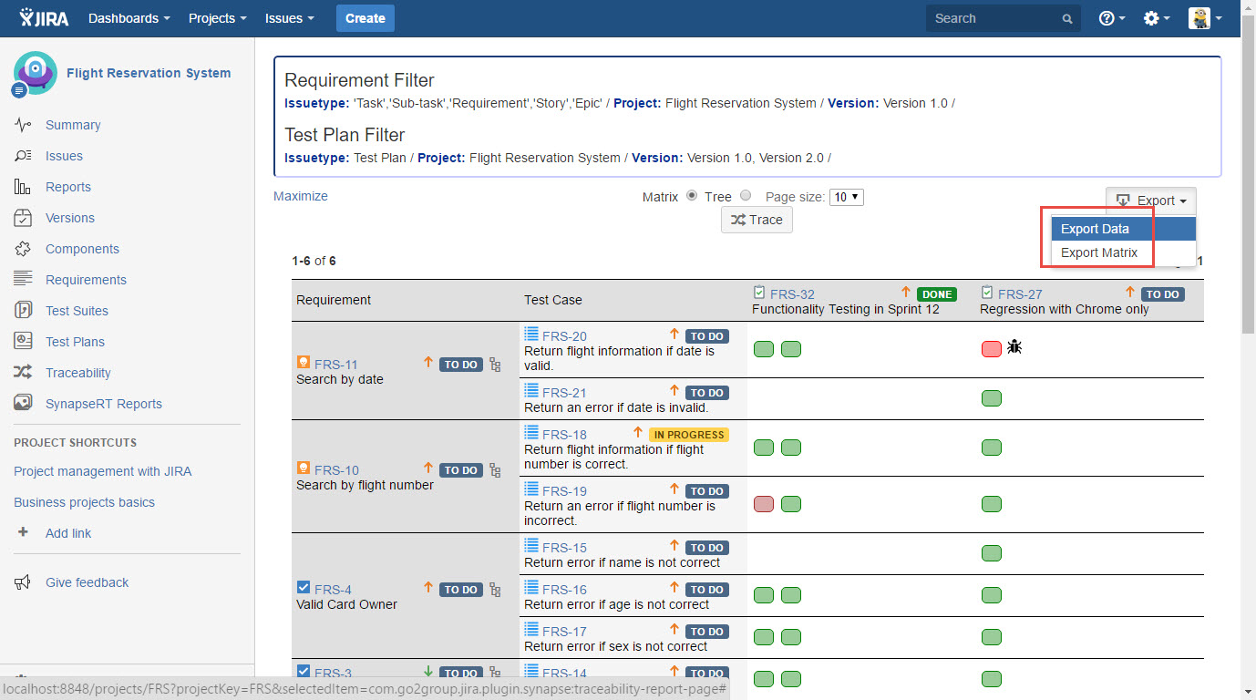 Both traceability matrix report and traceability list report can be exported to a .csv file. Click the "Export" button to export your traceability report.
