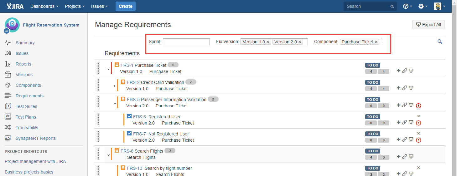 You are able to search requirements with three filter options: Sprint, Fix Version and Component.