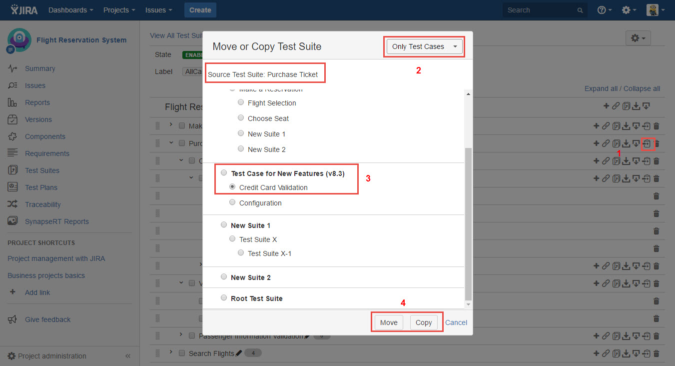 - Choose "Only Test Cases" from "Move or Copy Test Suite" dialog box