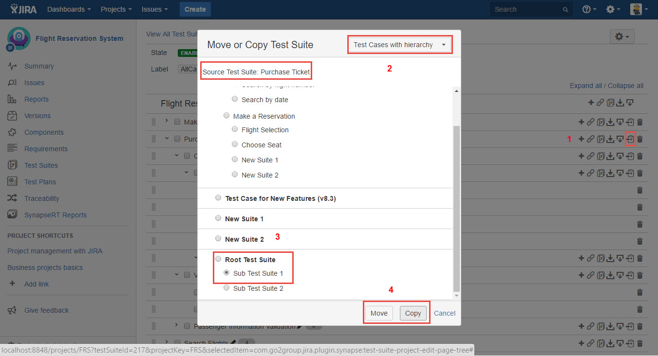 - Choose "Test Cases with hierarchy" from "Move or Copy Test Suite" dialog box