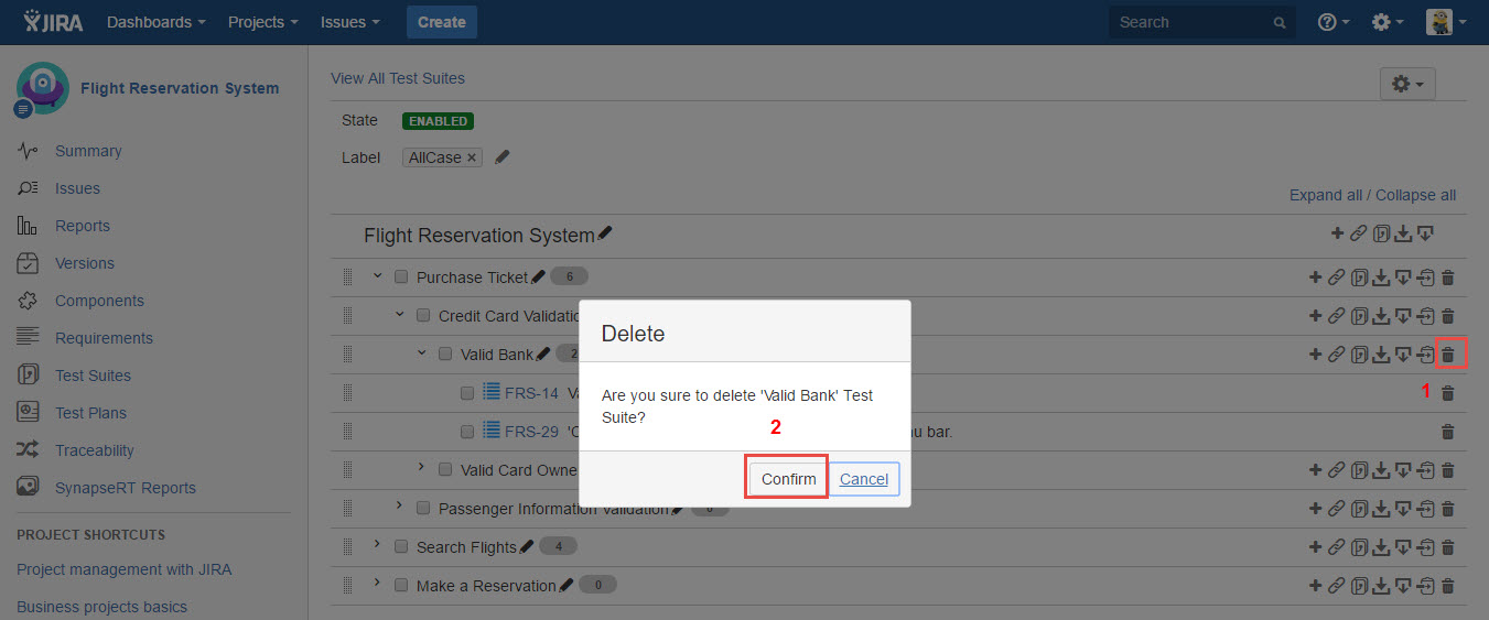 - Click the "Delete" icon from any Test Suite in the tree structure