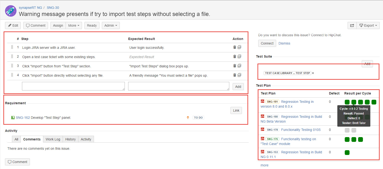 Below are the various panels in the view issue screen offered by synapseRT NextGen in a Test Case issue by default: