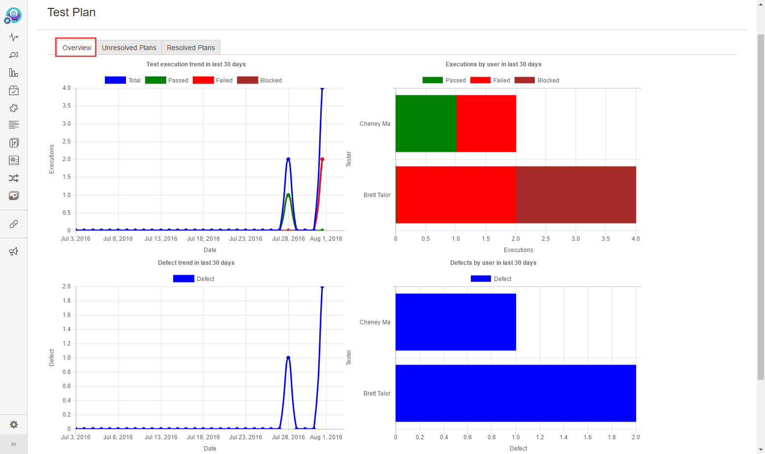 The overview tab presents trend charts on testing in the past 30 days, it is useful for management team to know the progress and results of testing activities.
