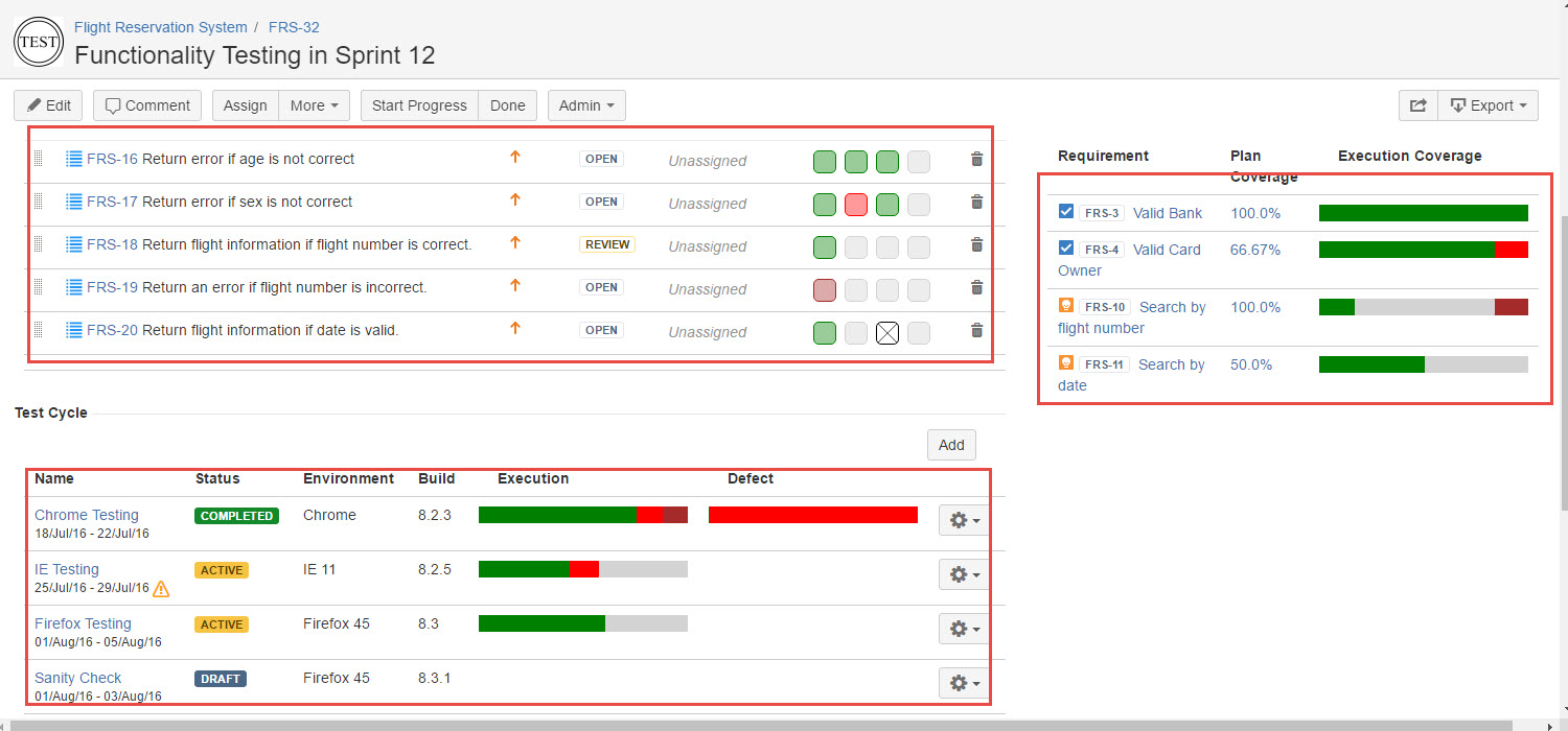 Requirement - This section displays the list of Requirements covered in the Test Plan. Here you will also be able to see % of test case coverage and execution result in the Test Plan.
