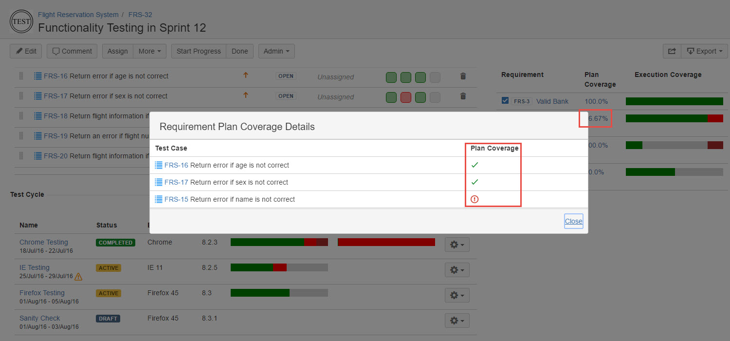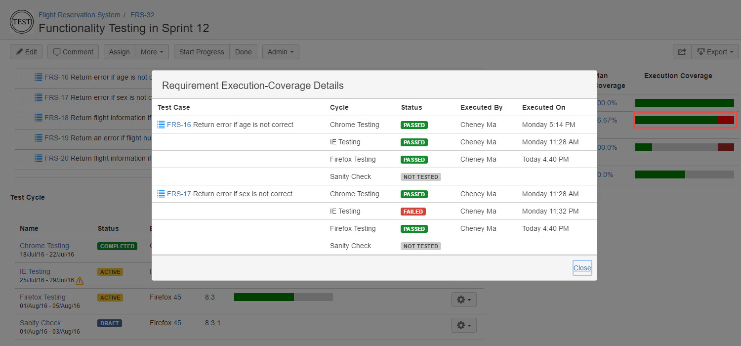 Execution Coverage - This dialog displays a list of Test Cases those are planned for execution from the particular Requirement, followed by test results in different Test Cycles.